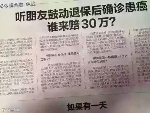 这个案例报纸都刊登了,2016年底保险公司前台客服接到一个客户来电,对方的情绪非常忐忑而焦急:“我老公最近总是觉得不舒服,上周去医院做了个检查,结果医生确诊说是肝癌……”电话那头的客户说到这时,都快哭出声音了……“我上个月刚把他的那份保险给退了,我想问一下我现在把钱给补交上,是否还可以赔偿30万?”