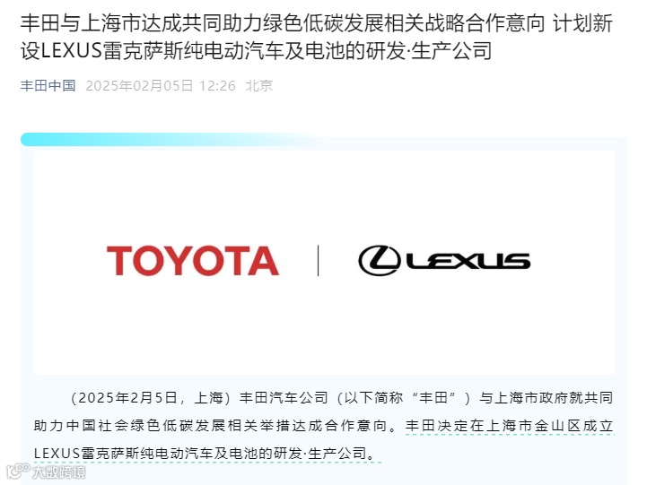 - 4月,丰田投资20亿美元在上海设立独资电动车公司,专注雷克萨斯纯电车型及电池研发,成为继特斯拉之后第二家在沪独资建厂的外资车企 [5] ;