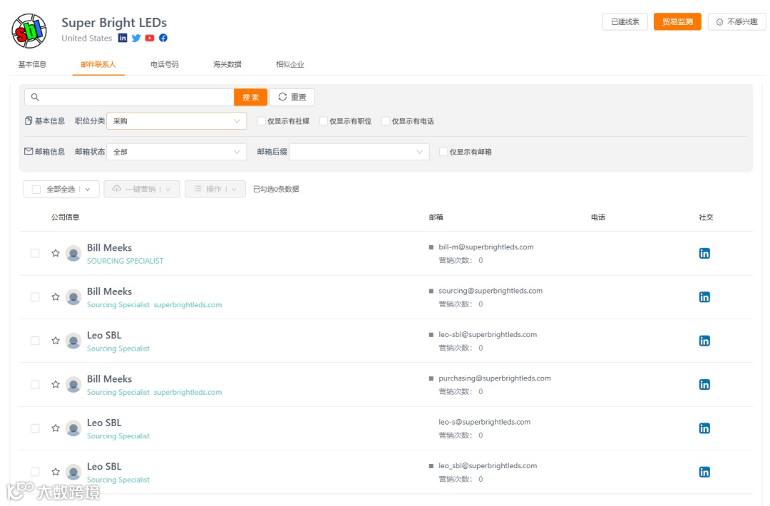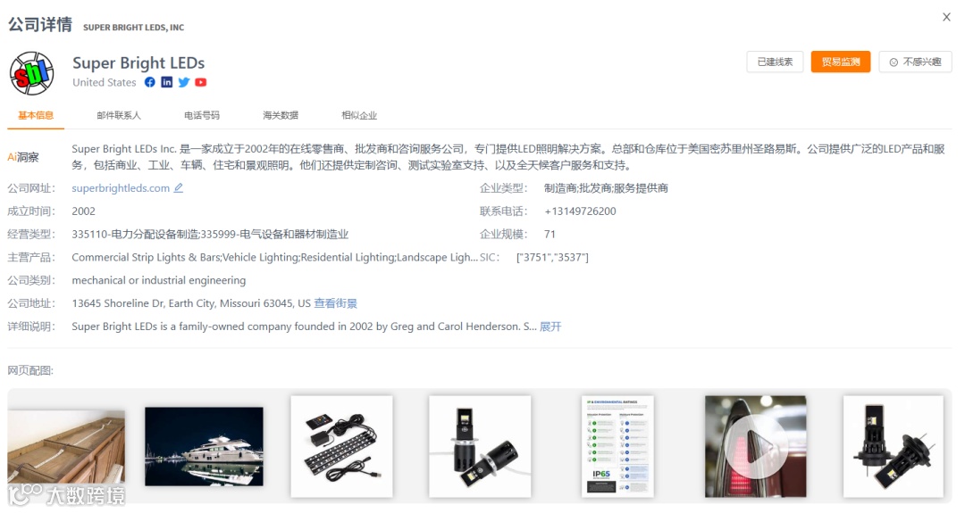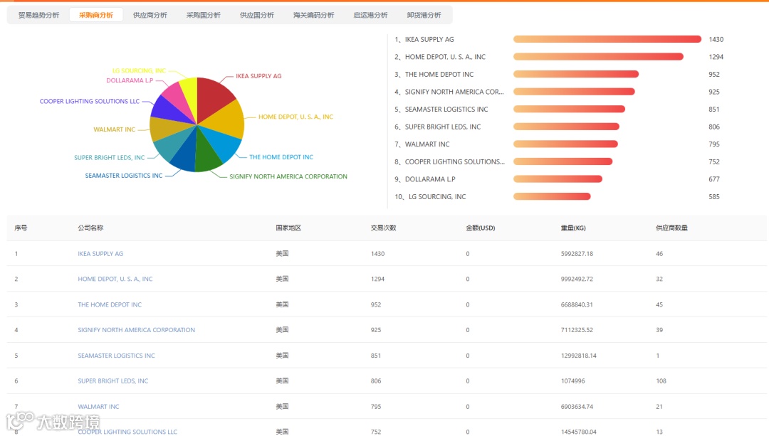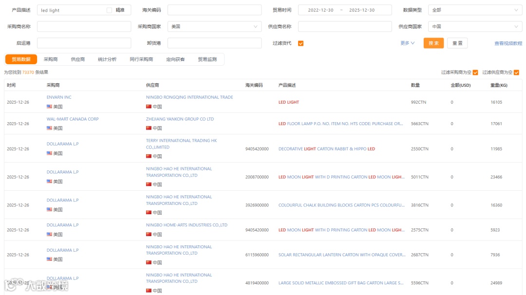 “贸小七”整合60个国家/地区的源头贸易数据及220个国家/地区的镜像贸易数据,支持按产品描述、进出口地、交易时间等维度检索贸易记录,并快速生成精准采购商清单。例如,美国近三年LED灯相关贸易记录超7.3万条 [3] 。