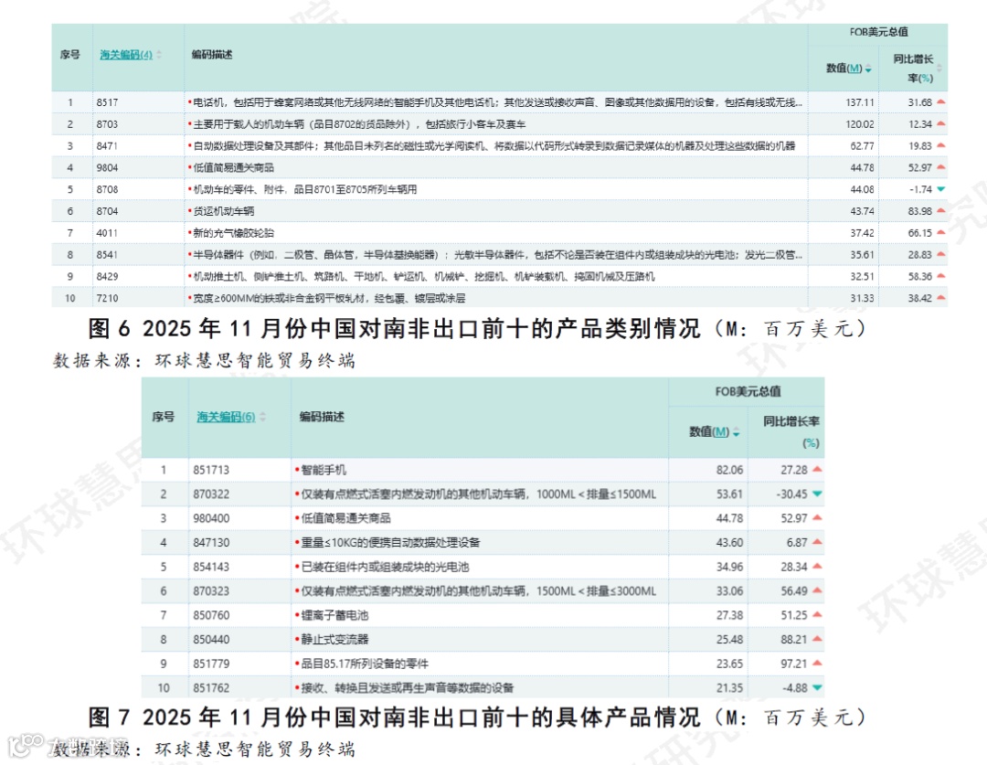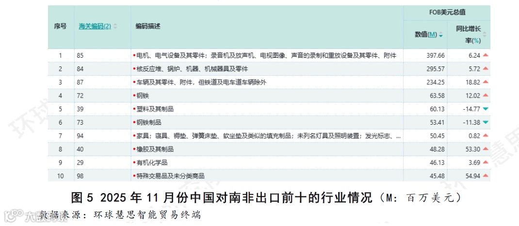 尽管南非当月出口总额环比显著下滑,但对其出口结构的深入分析显示,这一下降并未全面波及所有主要商品。在排名前十的行业、品类及具体商品中,多数项仍保持着同比增长。