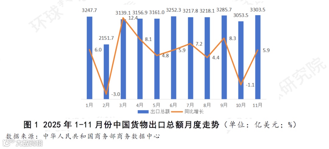 从2025年1-11月份中国货物月度出口总额来看(如图1),11月份出口表现强劲,实现了增速与规模的双向提升。当月出口额达3303.5亿美元,创下年内单月新高,同比增长5.9%。这一增速较10月份的-1.1%回升7个百分点,不仅扭转了上月的短期回落态势,也使其回升至接近6、7月份的增长区间,反映出出口动能的持续修复。从环比看,出口规模较10月份亦实现显著增长,进一步凸显年末冲高势头。整体而言,11月份的数据强化了今年以来出口在波动中逐步回升的路径,使“复苏与波动并存”的月度增长轨迹更趋明朗和稳固。