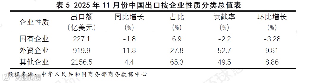 2025年11月份,中国出口按企业性质分类总值数据显示(见表5),从结构上看,以民营企业为主的其他企业,其65.3%的份额构成了出口的基本盘,体现了内资企业在对外贸易中的规模优势。从增长动能看,外资企业展现出更为强劲的拉动作用,其以27.8%的出口份额贡献了52.7%的增长额,显示出其在当前出口回升周期中扮演了关键增量角色;其他企业虽贡献了剩余49.5%的增长额,但4.4%的同比增速与其庞大的规模基数相比,显示出其增长路径更趋平稳。深层来看,本月出口增长来源于外资与民营企业,这既体现了中国深度融入全球分工体系与国内产业竞争力的结合,也提示增长结构存在一定依赖性。未来出口的可持续性,取决于民营企业能否在规模优势基础上进一步提升增长动能,以及外资企业的景气复苏能否延续。