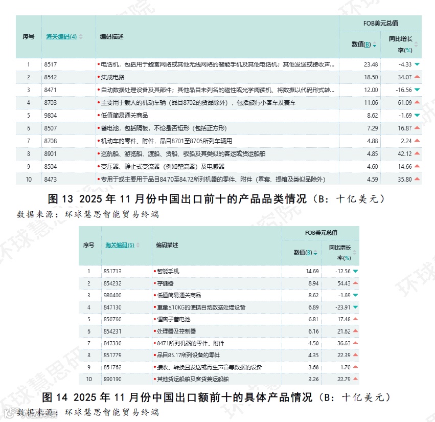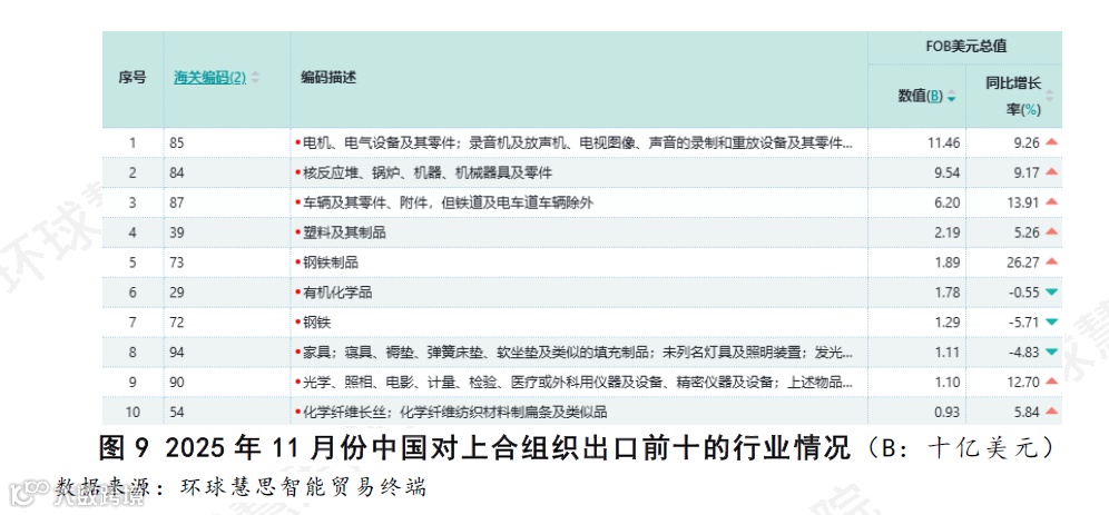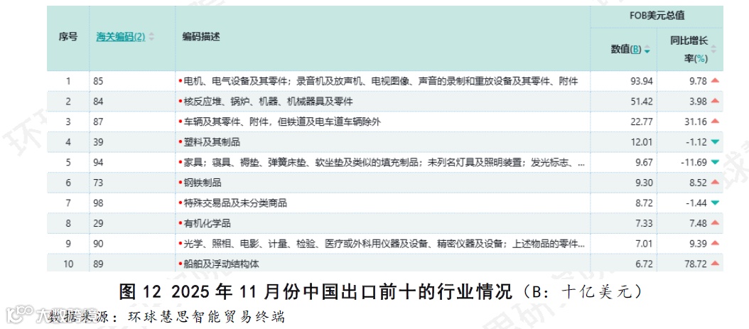 根据环球慧思智能贸易终端数据统计(如图12),2025年11月份,中国出口行业呈现主要依赖于少数几个技术密集型的制造业领域的特征。“电机、电气设备及其零件”行业以939.4亿美元的出口额占据显著领先地位,其规模接近排名第二的“核反应堆、锅炉、机械器具及零件”行业的两倍。上述两个行业与排名第三的“车辆及其零件、附件”行业共同构成了出口的主要部分。