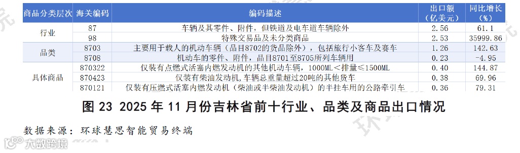 基于2025年11月份吉林省出口数据(如图23),“车辆及其零件、附件”与“特殊交易品及未分类商品”是绝对的出口主体,两者规模相当,合计占据了绝大部分份额,表明吉林的外贸由本土核心工业与特定的贸易形态共同作用。传统核心产业强劲复苏,以“主要用于载人的机动车辆”为核心的汽车产业是增长的坚实引擎。该品类同比增长142.63%,其下的具体商品“中高端排量汽油乘用车”及“柴油牵引车”构成了主力,体现了吉林作为传统汽车制造基地的产业韧性。但汽车产业链内部增长不同步,“机动车零件”出口同比微降,与整车的迅猛增长形成反差。吉林省本月增长本质上是其传统优势产业,汽车制造业实现了强劲反弹与增长。然而,出口结构过度依赖单一产业,整体多元性与抗风险能力有待加强。