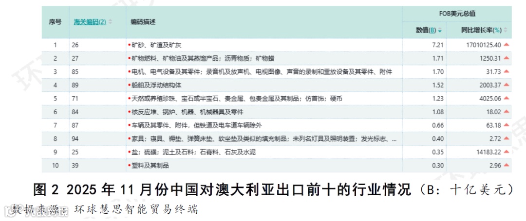 中国对澳大利亚出口排名前十的行业,合计构成了对澳出口的绝对主体,其中“矿砂、矿渣及矿灰”以72.1亿美元的出口额遥遥领先,凸显了资源贸易在双边贸易中的基石地位。紧随其后的“矿物燃料”与“电机、电气设备及其零件”行业规模相近,但与前一名存在巨大断层。这种结构表明,中国对澳出口与澳大利亚的资源需求周期联系紧密,头部行业的主导效应突出。(如图2所示)