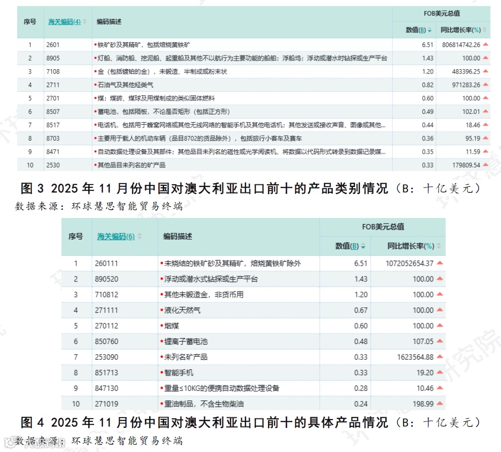“矿物燃料”行业的增长,主要由“石油气及其他烃类气”和“煤”品类驱动,对应的商品分别是“液化天然气”和“烟煤”。这些商品出口额的大幅增长,与澳大利亚在能源领域的实际进口需求增长直接相关。“船舶及浮动结构体”行业,其主要由浮动式钻探或生产平台这一单一商品支撑。这并非普通消费品,而是典型的重型资本品,其出口印证了澳大利亚在海上油气等资源开采领域正在进行重大的资本投资,并将中国视为核心设备供应商。(如图2-4所示)