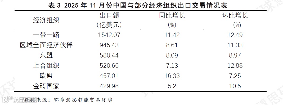 根据环球慧思智能贸易终端数据统计(见表3),2025年11月份,中国对主要经济组织的出口呈现出清晰的市场格局与增长态势。从规模上看,“一带一路”经济体以1542.07亿美元的出口额占据主导地位,其规模是第二大市场区域全面经济伙伴的1.6倍,构成了中国出口最核心的支柱。与东盟、上合组织、欧盟及金砖国家共同形成了多元化的支撑板块。
