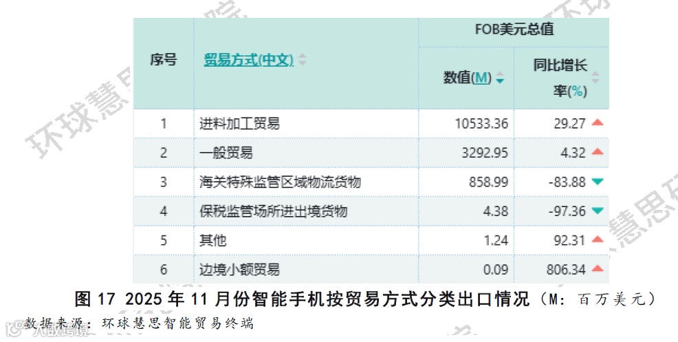 中国智能手机出口的增长,主要由外资品牌主导的进料加工贸易所驱动,而自主品牌通过一般贸易出口的增长相对乏力。进料加工贸易出口额高达105.33亿美元,并且保持了29.27%的高速增长。这反映出当月智能手机出口的绝大部分增量,来源于海外品牌提供核心设计与部件、在中国完成高价值组装后再出口的“代工”模式。相比之下,代表中国自主品牌出口的一般贸易模式,虽然规模达32.93亿美元,但其同比增速仅为4.32%,远低于进料加工贸易。这意味着自主品牌的出口扩张速度,并未跟上行业整体的出口增长步伐。(如图17)