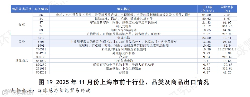 从品类和具体商品层面,可以看出新能源汽车是首要驱动力,“主要用于载人的机动车辆”品类及其下的“仅装有驱动电动机的机动车”同比增长均增长,是先进制造业出口中最突出的增长点。高端船舶出口表现亮眼,“巡航船、游览船、渡船、货船、驳船及其类似的客运或货运船舶”品类增长66.90%,其核心商品“液货船”同比飙升226.62%,显示出上海在高端装备制造领域的竞争力。集成电路出口稳健但分化,作为最大单一品类的“集成电路”实现了12.41%的稳定增长,但内部呈现分化,“处理器及控制器”同比微降,而“存储器”和“其他集成电路”则保持正增长,体现了该产业链的复杂性。部分大宗商品与原材料异动显著,“未锻轧的精炼铜”与“重油制品”的出口额分别实现了异常惊人的同比增长,这与特定贸易活动、国际市场价格或短期供应链调整有关,是拉动本月增速的重要“变量”,但其可持续性有待观察。