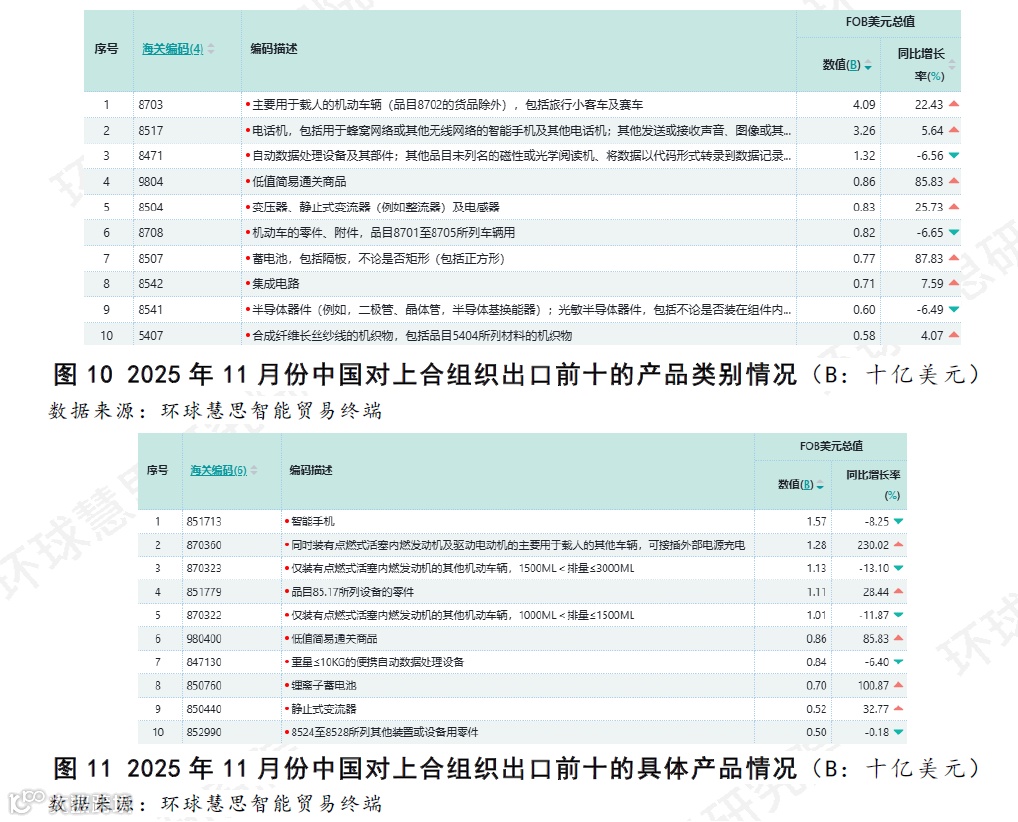 “核反应堆、锅炉、机械器具及零件”行业的出口构成相对复杂。传统支柱“自动数据处理设备”品类出口额同比下滑,而“集成电路”等关键电子元器件则保持增长。这反映出行业出口重心呈现出从终端设备向核心基础部件延伸的趋势。“车辆及其零件、附件”行业是本月增长的主要动力之一。整车出口是核心驱动力,其中可插电混合动力车辆与传统燃油车共同构成增长主力。与之对应的是,“机动车零件”品类出口同比下滑,表明当前增长主要依靠整车成品输出,零部件贸易尚未同步扩张。(如图9-11)