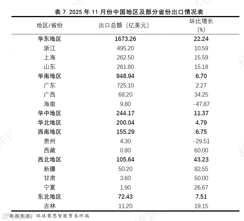 据环球慧思智能贸易终端数据统计(见表7),本月中国区域出口,西北地区和华东地区是主要增长极。西北地区以43.23%的环比增速遥遥领先,其增长多由新疆的单极爆发所驱动,甘肃和宁夏也贡献了高增速。华东地区作为出口规模的绝对核心支柱,在庞大基数上仍实现了22.24%的较高增速,其中山东、上海、浙江等主要省份同步向好,形成了“规模与增速兼具”的增长模式,是本月出口大盘最坚实的支撑。增长压力来源于少数省份的深度下滑,由此抵消了部分增长幅度,其中海南和贵州的环比跌幅最为显著,但由于其出口额较小,对全国总量的直接影响有限。更值得关注的是,作为三大出口核心省份之一的广东,其环比增速仅为2.27%,显著低于全国多数主要省份。