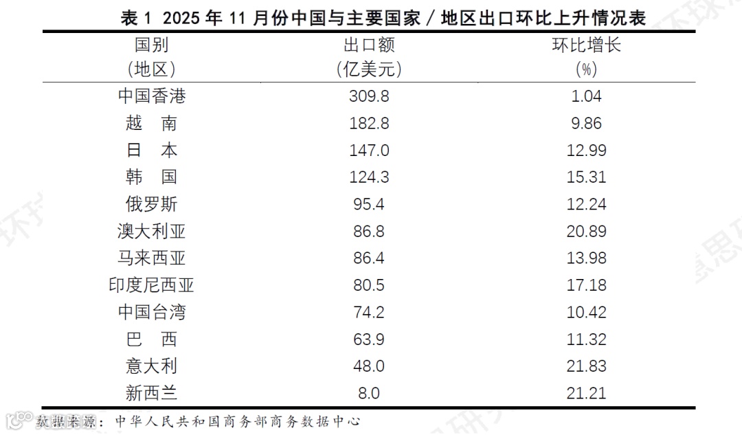 商务部商务数据中心数据显示(见表1),在实现环比正增长的市场中,传统主力市场与新兴增长区域的协同回升,推动了本月出口总额创出新高,市场多元化格局对出口稳定性的支撑作用进一步凸显。以意大利、新西兰及澳大利亚为代表的部分经济体增速超过20%,展现出强劲的上行动力;日本、韩国、印尼等多个市场亦实现双位数增长,构成了本月出口回暖的核心支撑。作为最大出口目的地的中国香港维持了环比正增长,但增幅有限,显示其需求进入平稳阶段。
