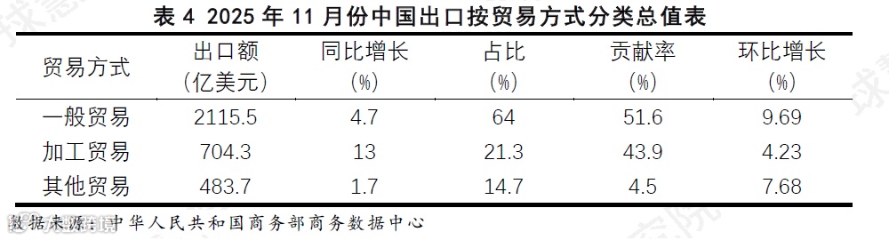 根据商务部商务数据中心统计(见表4),2025年11月份,中国出口贸易方式的结构保持稳定,但增长动力呈现明显变化。从增长贡献看,动力来源进一步向传统贸易方式集中。一般贸易以4.7%的同比增速,凭借其规模优势贡献了过半增长额,继续发挥稳定器作用。加工贸易则表现出较强的增长弹性,其13%的同比增速与43.9%的贡献率,反映出其在产业链需求回暖时率先复苏。其他贸易方式增长平缓。本月出口增长主要依靠一般贸易与加工贸易共同拉动,两者合计贡献超九成的增长额。这一结构表明,在外部需求阶段性改善的背景下,一般贸易的产业链纵深与加工贸易的全球供应链灵敏度,形成了互补的拉动格局,共同支撑了整体出口的回升。