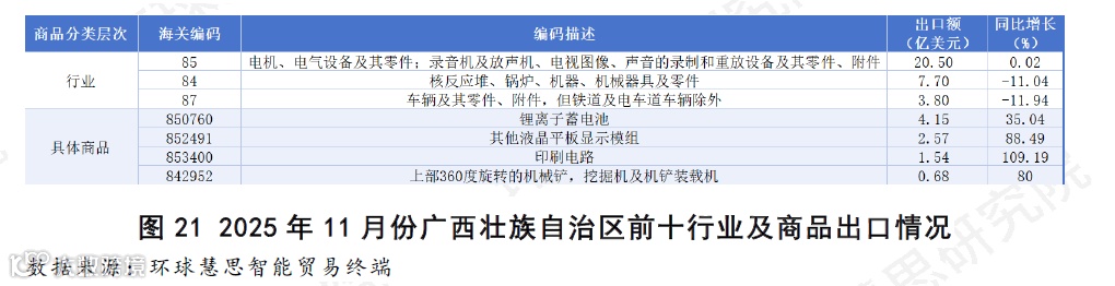 基于2025年11月份广西壮族自治区的出口数据(如图21),其出口高度集中于机电与车辆制造领域,“电机、电气设备及其零件”行业与“核反应堆、锅炉、机器、机械器具及零件”和“车辆及其零件、附件”共同构成了出口的绝对支柱,奠定了技术密集型出口的基调。以“锂离子蓄电池”为首的关键商品为增长主引擎。该商品出口额达4.15亿美元,同比增长35.04%,可以看出广西在新能源全球产业链中正占据一席之地 。同时,“印刷电路”与“其他液晶平板显示模组”分别实现了109.19%和88.49%的增速,表明广西正加速融入电子产业的全球中间品供应链中。装备制造潜力显现,“上部360度旋转的机械铲、挖掘机”80.00%的高增长,展示出广西在工程机械等特定装备制造领域的出口竞争力正在快速释放。