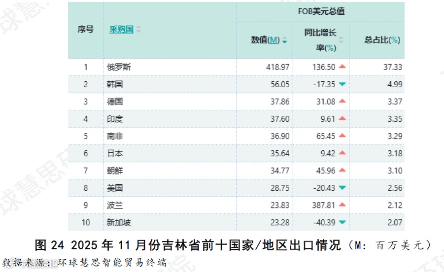 如图24所示,俄罗斯市场位于吉林省出口的主导地位,吉林省对俄罗斯的出口额是韩国的7倍以上,且同比大幅增长136.50%,是拉动其整体出口增长的核心。可以看出,吉林省的增长并非源自传统市场的均衡回暖,而是由对一个关键市场的深度开拓所驱动。作为传统重要市场的韩国和美国,出口额同比分别下降17.35%和20.43%,而德国、日本等传统市场虽保持正增长,但增速远低于俄罗斯,贡献有限。新兴市场成为核心增长极,吉林省对波兰的出口以387.81%的增速,与南非、朝鲜共同构成了吉林出口增长的新兴板块。