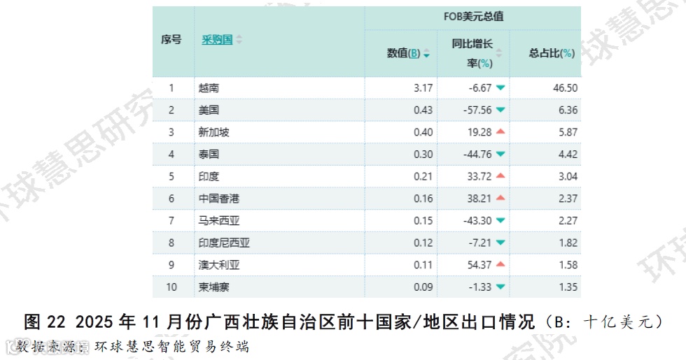 如图22所示,广西对越南的出口占据绝对主导但增长乏力,越南以46.50%的总占比成为广西首要出口市场,但其出口额同比下降6.67%。这表明广西外贸的基本盘高度集中且面临压力,值得注意的是除越南外,另一主要传统市场美国的出口额同比大幅下降57.56%,泰国、马来西亚等亚洲传统伙伴也超过40%的降幅。