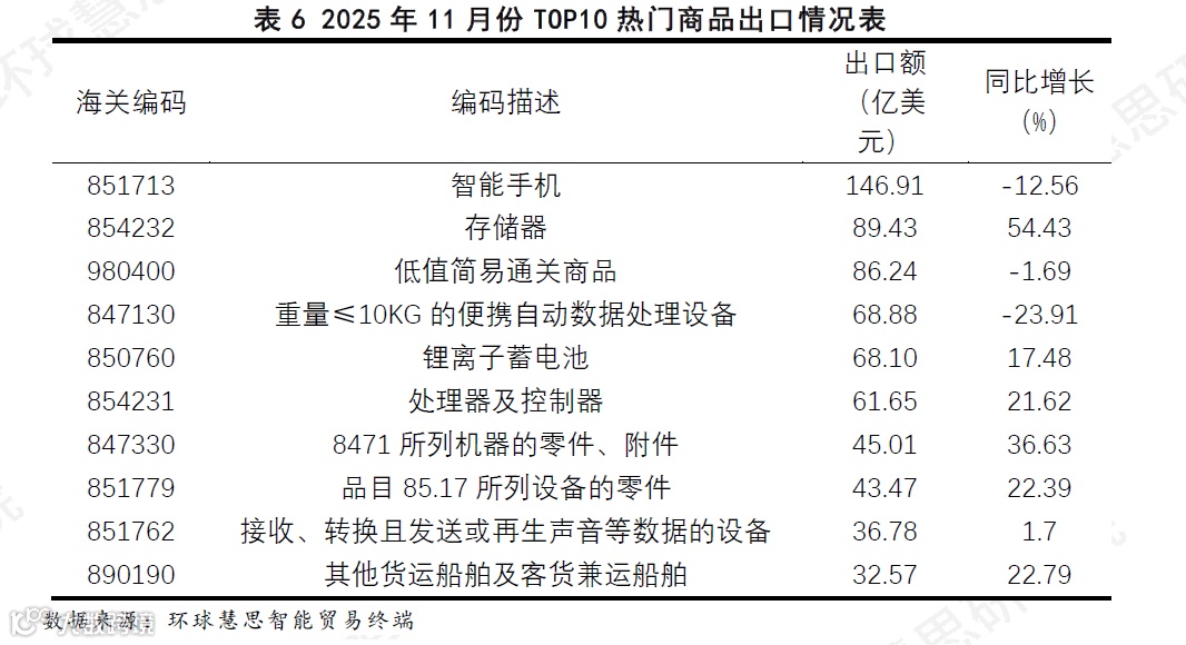 2025年11月份,根据中国出口额排名前十的具体商品可以看出,位居首位的智能手机是唯一的终端消费品代表;而紧随其后的第2至第10名,则由存储器、处理器、锂离子蓄电池、各类精密零件以及货运船舶等7项关键中间品与资本品占据。这不仅表明中国出口的支柱已超越单一最终产品,更凸显出其在全球半导体、新能源和高端制造供应链中作为核心部件供给者的关键角色。在这一由核心部件主导的出口结构中,排名榜首的智能手机作为唯一的终端消费品代表,尤为值得深入分析。(如表6)