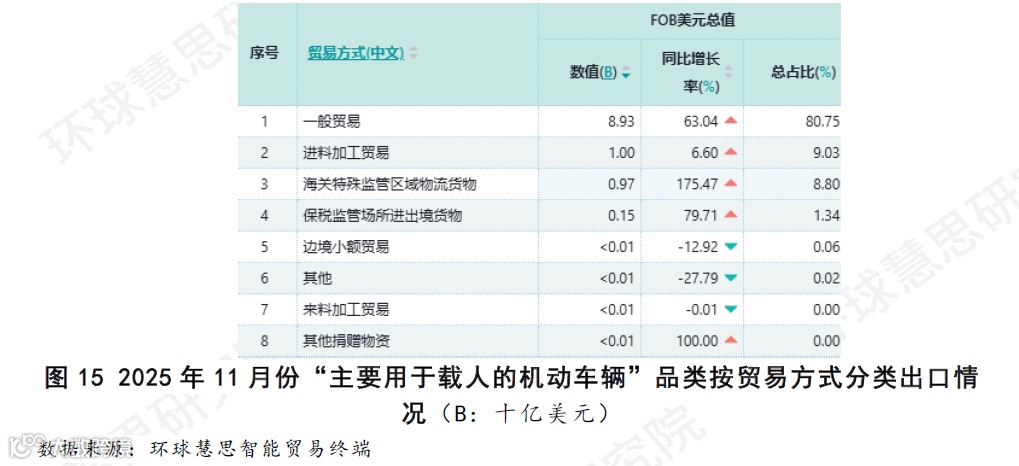 “车辆及其零件、附件”行业是前三大行业中增长最为迅猛的领域,其增长已转变为由自主品牌整车出口主导。主要由于品类“主要用于载人的机动车辆”同比大幅增长61.09%;且该增长以“一般贸易”方式为主体,这直接体现了自主品牌的输出。相比之下,其配套“零部件”增速仅为2.24%,表明增长动力源于整车直接出口而非零部件间接配套。这一结构性转变,说明中国汽车出口在国际市场上实现了从“加工装配”到“品牌输出”的关键跨越,这一强劲表现主要得益于中国新能源汽车在海外市场取得的突破性进展。(如图12-15)