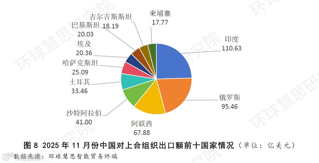 数据显示(如图8),印度和俄罗斯居于领先地位,两国合计占前十国总额的近一半,显示出中国与这两个经济体之间的紧密联系。紧随其后的是阿联酋、沙特阿拉伯和土耳其等西亚重要经济体,显示出中国与海湾及欧亚枢纽地区稳健的经贸往来。其余国家如哈萨克斯坦、埃及、巴基斯坦、吉尔吉斯斯坦和柬埔寨,形成了规模可观且需求稳定的市场。从地理分布看,这十大市场广泛覆盖南亚、中亚、西亚、北非与东南亚,其中西亚与中亚国家占据多数席位,这不仅展现了中国出口网络的广阔覆盖,也印证了上合组织下经贸合作的区域深度与多元格局。