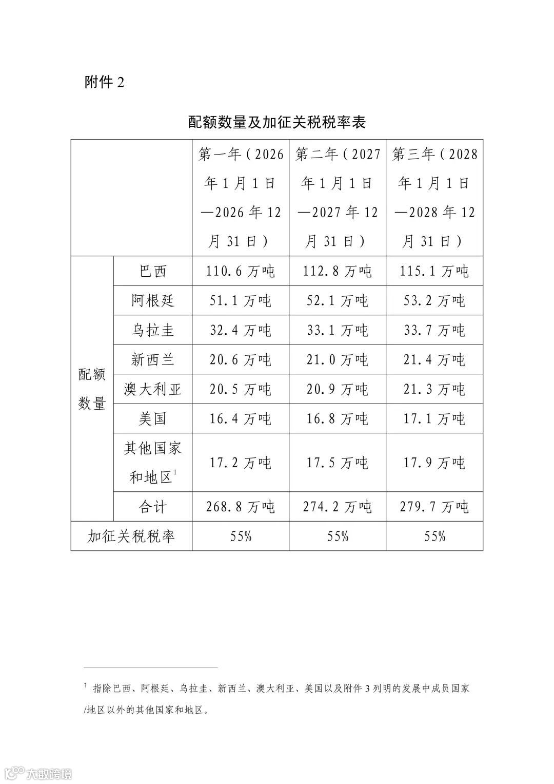 依据《保障措施条例》第二十条,国务院关税税则委员会决定:对超出规定国别配额的进口牛肉,在现行适用关税税率基础上加征55%关税。