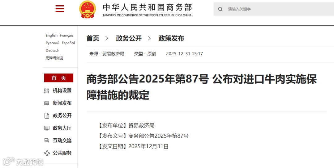 12月31日,商务部发布公告,裁定进口牛肉数量增加对中国国内产业造成严重损害,且二者存在因果关系,决定自2026年1月1日起对进口牛肉实施为期3年的保障措施,至2028年12月31日止。