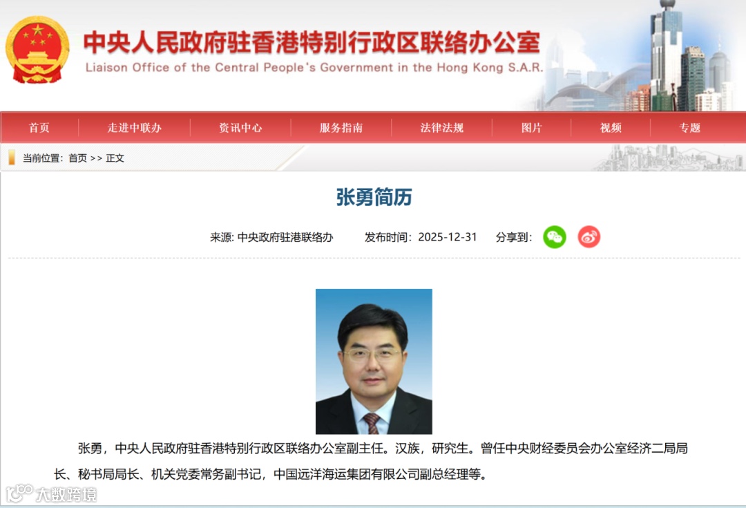 据中央政府驻港联络办(以下简称“中联办”)最新消息,原中国远洋海运集团有限公司(中远海运)党组成员、副总经理张勇已出任中联办副主任 [2] 。