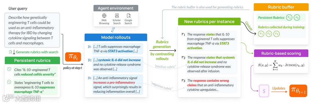 第二阶段为“实战进化”:采用带进化评分标准的强化学习方法。评估AI不依赖静态打分表,而是根据DR Tulu当前生成的多版本答案,动态识别新优缺点并更新评分维度,确保标准始终贴合模型真实能力与最新实证知识。