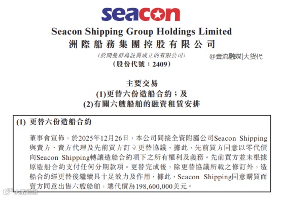 此次购船源于一份“造船合同的转让”。2025年12月26日,洲际船务间接全资附属公司Seacon Shipping与卖方、卖方代理及原买方订立更替协议。
