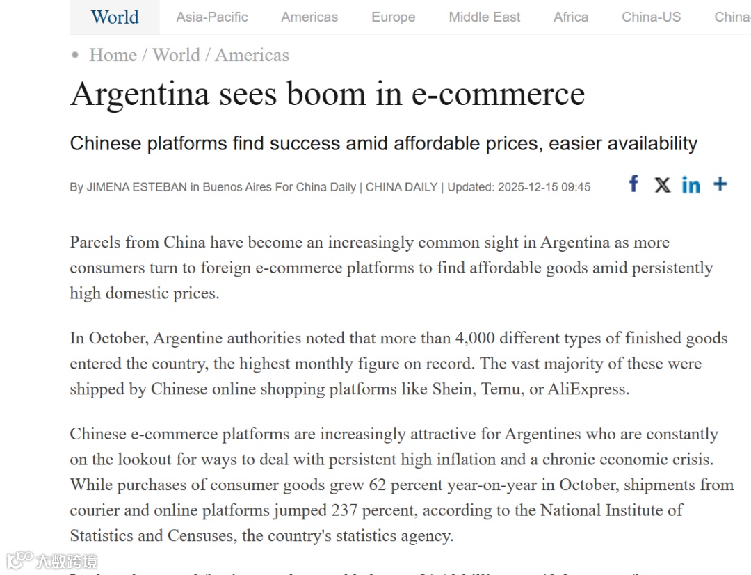 2024年9月,中国已超越巴西,成为阿根廷第一大贸易伙伴;当地80%进口服装来自Shein;Temu发往阿根廷的日均包裹量达20万件。