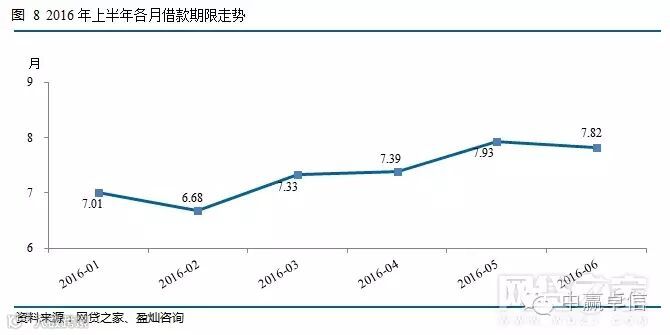 2016年上半年网贷行业平台借款期限为7.41个月,行业平均借款期限主要受一些成交量较大且平均借款期限在半年以上的平台影响。从2016年上半年各月的借款期限走势来看,总体呈现小幅上升的态势。