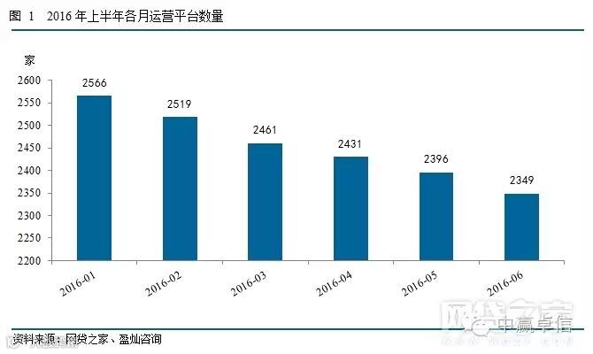 在经历了前两年平台大幅度增长的过程后,今年上半年P2P网贷平台数量呈现了阶梯下降的走势,2015年底全国正常运营平台数量有2595家,而截至2016年6月底,正常运营平台数量已经下降至2349家,半年时间减少了共246家正常运营平台。预计正常运营平台数量仍然将进一步下降。