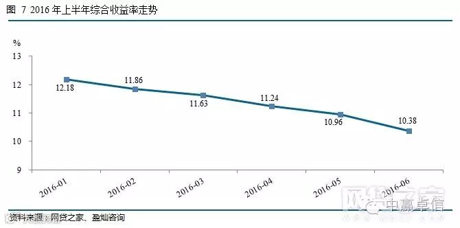 2016年上半年网贷行业总体综合收益率为11.31%,相比2015年全年网贷行业总体综合收益率下降了198个基点(1个基点=0.01%)。从上半年的走势看,上半年前6个月呈现单边下跌的态势。随着国家继续保持宽松的货币政策,诸如银行理财的固定收益产品收益率不断下降,越来越多的人涌入P2P网贷行业,而他们的去向大多是知名的大平台,由于大平台的投资收益率相比行业的综合收益率要低,这样也引起了行业综合收益率不断下滑。