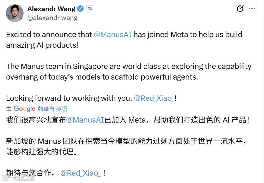 Meta首席AI官Alexandr Wang已公开欢迎Manus团队加入。此次收购不仅引入成熟AI智能体技术,也补强了Meta在企业级AI落地能力上的关键一环。