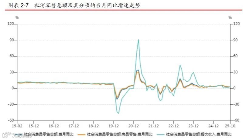 社消零售单月增速自6月4.8%逐月回落至10月2.9%,“国补”退坡后消费再度承压 [2] 。10月商品零售同比增2.8%,除汽车外消费品零售增4.0%,汽车作为大宗消费主力明显回落;餐饮收入虽10月回升至3.8%,但整体仍偏弱修复 [2] 。