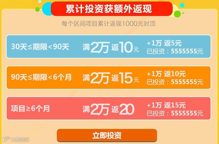 活动期间,只要在相应区间内投资,累计投资额达到2万即可获得相应返现,超过2万可继续获得返现,累计返现1000元封顶。