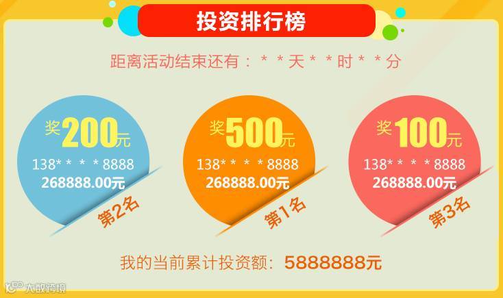 活动结束后,针对5月18日-5月31日所有投资用户(首投除外)累计投资额进行排行,排名前3,将获得相应的现金奖励。