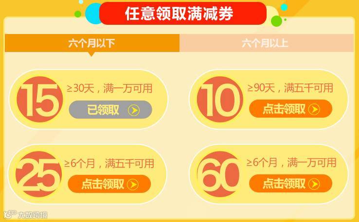 活动期间,可根据投粉自己的投资期限,来选择适合的满减券,分为六个月以下和六个月以上,共8种满减券。