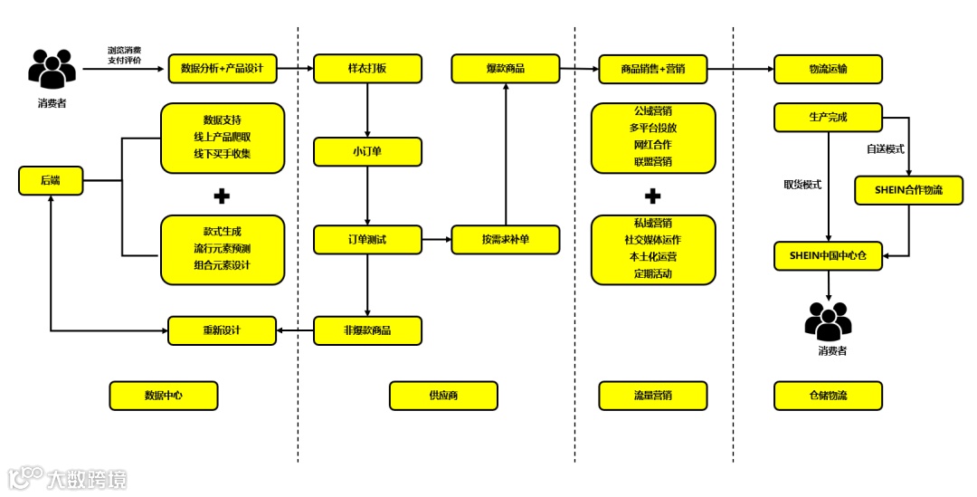 本阶段,SHEIN进入高速成长期,建成以“数据驱动+小单快反”为核心的柔性供应链闭环:通过网站与App实时监测销售、浏览、搜索等行为数据,指导新品试产(首单100–200件)、动态追单或快速下架,联动面料商、工厂、物流商共享信息,大幅提升库存周转与趋势响应效率。