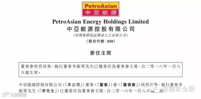 投融长富董事长李振军获委任中亚能源(HK850)执行董事