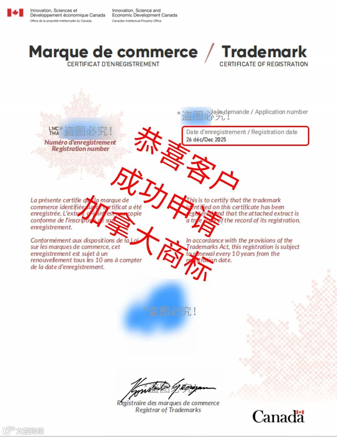 图/客户成功申请加拿大商标,盗图必究!