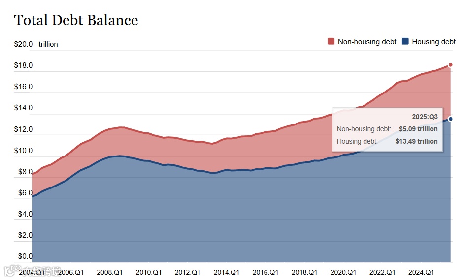 据纽约联储《家庭债务及信贷报告Q3》,美国总债务已达18.59万亿美元,信用卡违约率达近十年高点。