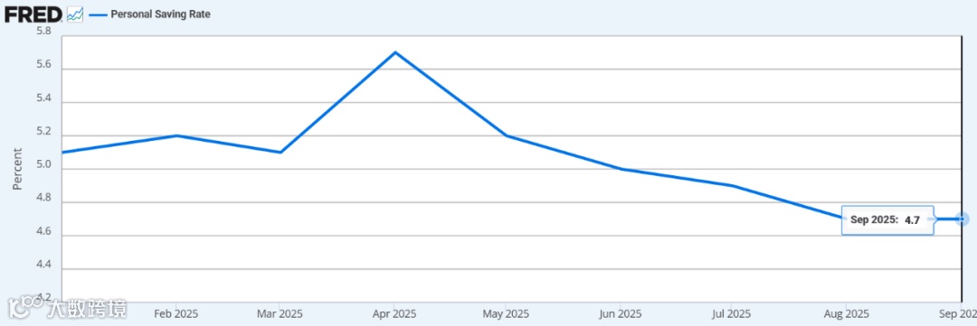 美联储(FRED)实时数据显示,美国个人储蓄率已跌至约4.7%,居民可支配“闲钱”显著减少。