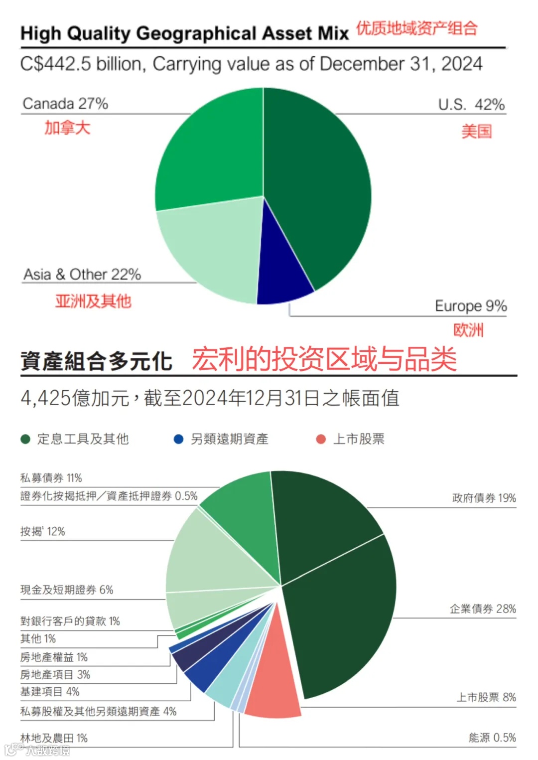 以某头部公司为例:截至2024年末,其资产配置中42%投向美国、27%投向加拿大、22%投向亚洲及其他地区、9%投向欧洲;涵盖上市股票、政府债券、私募债、房地产、基建、私募股权等十余类资产。