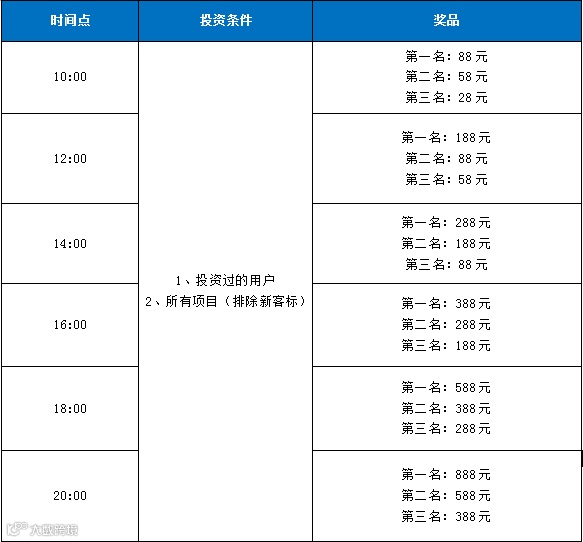 直播当天,以下时间点(10:00 12:00 14:00 16:00 18:00 20:00)时,当前个人活动当天累计投资总额排行前3名的用户还将获得对应双十一投资现金。
