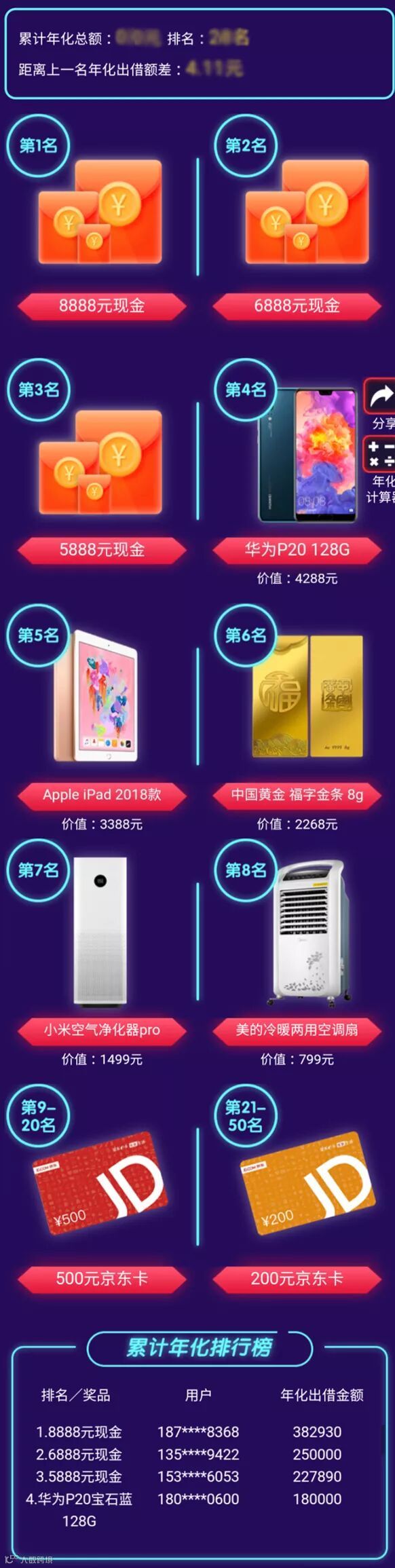 活动期间,年化出借额排行前50名可获得相应奖励