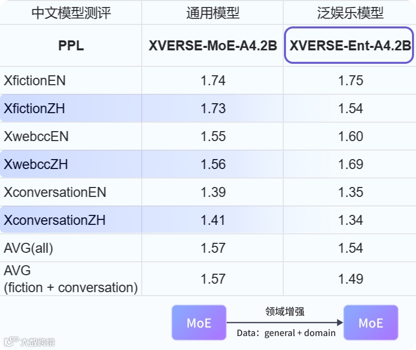 - 英文版 XVERSE-Ent-A5.7B:总参数量 36B,依托成熟出海应用经验打造,在英文创意写作、游戏对话及跨文化交流中表现优异。