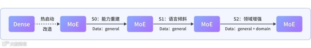 2. 多阶段训练策略:通过 S0 能力重建、S1 语言倾斜、S2 领域增强三阶段训练,构建专用模型。前两阶段使用通用数据,S2 阶段融合通用与领域数据。