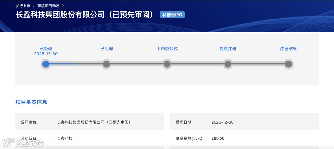 长鑫科技科创板IPO获受理,拟募资295亿元