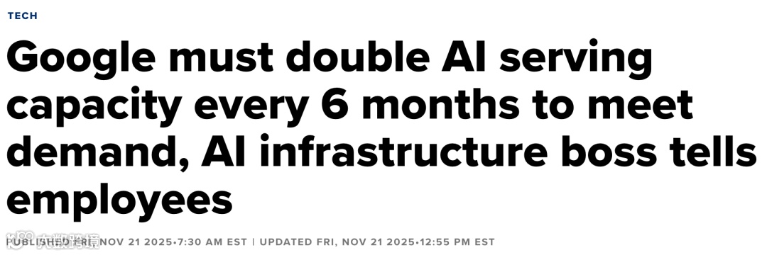 物理定律仍是严苛约束:单芯片功耗逼近1000W,迫使DeepMind全面采用液冷方案。2025年起,“AI工厂”正式取代“数据中心”称谓 [21] 。谷歌基础设施CEO Amin Vahdat明确要求:未来4–5年内算力能力须增长1000倍,且每六个月翻倍 [22] 。2025年上半年,AI数据中心投资占美国GDP增长逾90% [23] 。DeepMind内部共识是:若能看到1000倍算力带来的智能红利,任何低于此数的投入都是风险 [24] 。