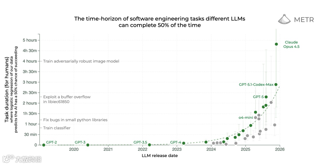 METR时间跨度图:智能的量化加速:作者推崇METR评估体系。两年前,AI稳定完成人类耗时9分钟的任务;至2025年底,已跃升至4小时以上 [28] 。按当前Scaling趋势,2028年AI有望独立完成人类专家需数周才能完成的科研或工程任务 [29] 。